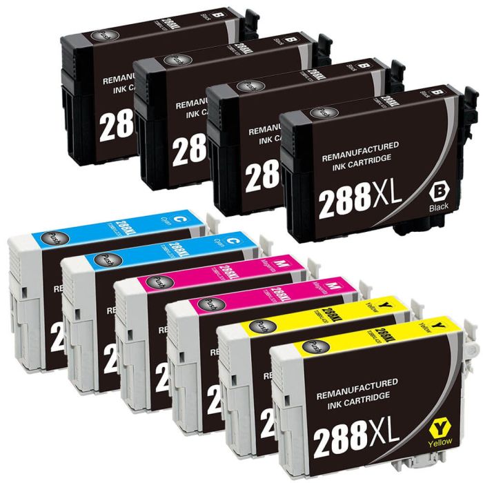 ComboInk Epson 288XL T288XL Series (10-pack) replacement High Yield Ink Cartridge (4x Black, 2x Cyan, 2x Magenta, 2x Yellow) will replace your original equipment manufacturer (OEM) cartridges for a fraction of the cost. Our replacement printer cartridges are professionally engineered to meet the highest quality and performance standard (ISO-9001). We also inspect our ink cartridges to be leak-free and have no print head nozzle clogging prior to stocking. Using our reliable, discount Epson 288XL T288XL Series (10-pack) replacement High Yield Ink Cartridge (4x Black, 2x Cyan, 2x Magenta, 2x Yellow), you'll get vibrant, high-quality results from your printer. Plus you can shop with confidence knowing that ComboInk inkjet cartridges are backed with a one-year 100% satisfaction guarantee.