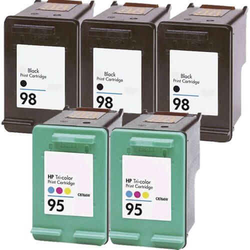 Save more and get more with this replacement Hewlett Packard (HP) 98 and 95 combo pack of five printer cartridges. The set includes three black ink cartridges and two tri-color ink cartridges. The replacement HP 98 ink cartridges and HP 95 ink cartridges are just as high quality as original HP cartridges and are compatible with HP DesignJet, HP DeskJet, HP OfficeJet, and HP Photosmart printers. All ComboInk HP 95 and HP98 inkjet cartridges are thoroughly inspected for possible leakage and completely cleaned, including the printhead nozzles. Worn components are replaced and electrical circuitry is tested. The quick-drying, pigment-based ink offers optimum performance and productivity with superior resistance to smudging and bleeding. Our HP 95 and 98 ink cartridges will never void your printer's guarantee. The HP 98 and HP 95 replacement cartridges are ideal for printing from everyday documents to vivid photos of your special memories.